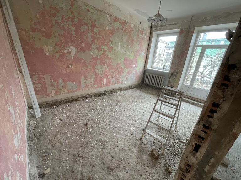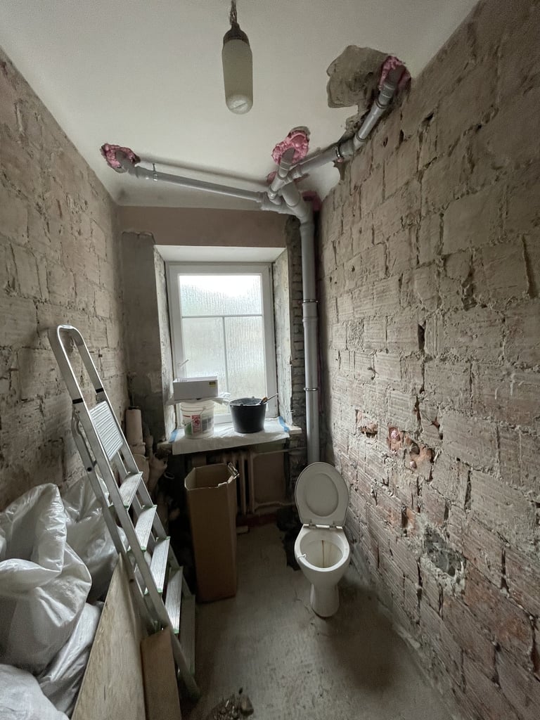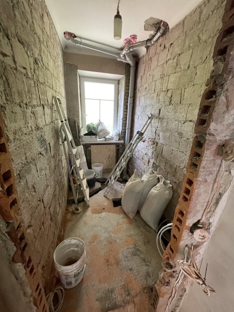 Sanitarinio mazgo sienų griovimas ir perstatymas: Išgriautos senos sienos ir sukurta nauja erdvė erdviam ir šiuolaikiškam sanitariniam mazgui.