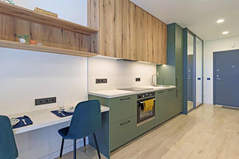 Baldų įrengimas: Baldai buvo parinkti ir pritaikyti taip, kad užtikrintų ne tik funkcionalumą, bet ir estetiką, suderintą su bendru buto stiliumi.